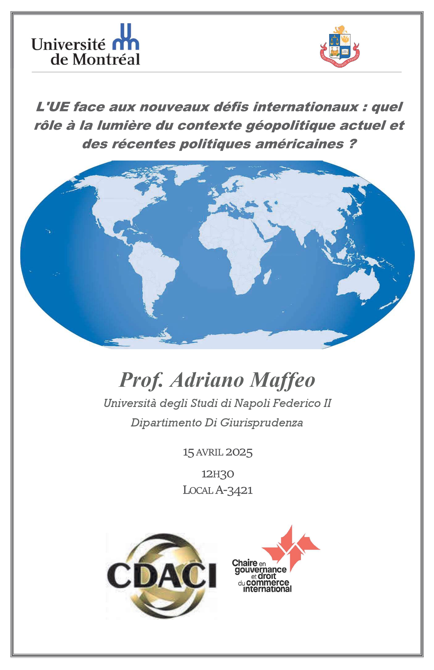 Conférence le 15 avril : «L’UE face aux moyens défis internationaux : quel rôle à la lumière du contexte géopolitique actuel et des récentes politiques américaines ?», par Adriano Maffeo
