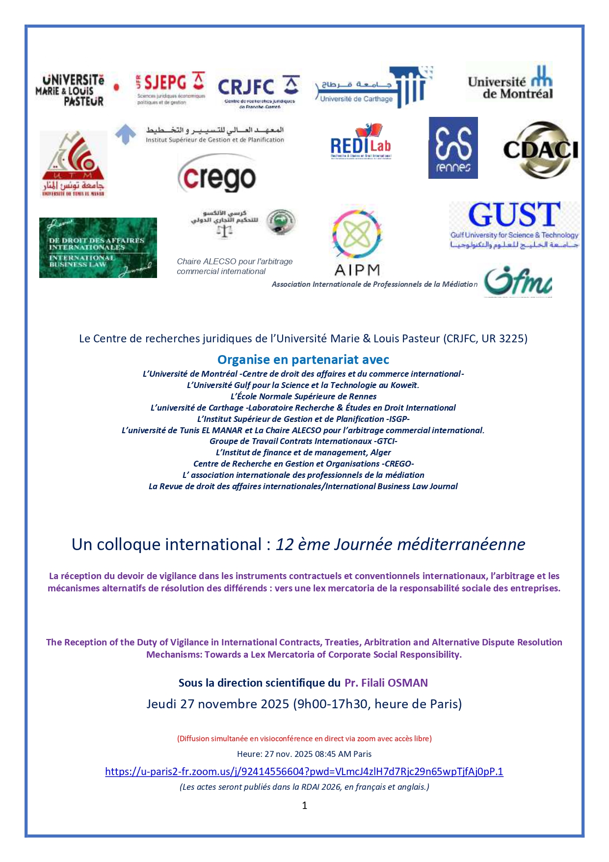 Ce colloque était organisé par le Centre de recherches juridiques de l’Université Marie et Louis Pasteur, en partenariat notamment avec l’Université de Montréal, l’Gulf University for Science and Technology, l’École Normale Supérieure de Rennes, l’Université de Carthage et l’Université de Tunis El Manar, ainsi que plusieurs autres institutions universitaires et groupes de recherche internationaux.